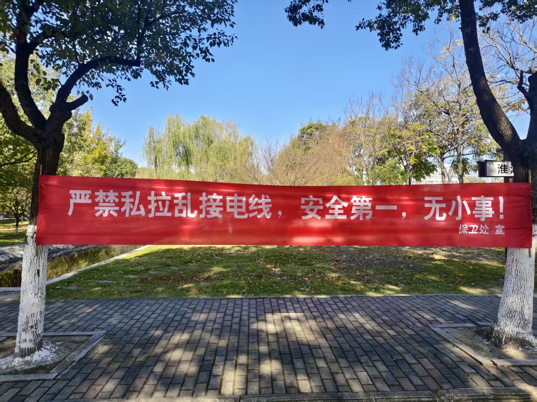 为进一步做好学校消防安全教育宣传及全校师生消防意识培养。继11月12日上午开展了系列消防知识培训和冬季消防灭火演练活动后,保卫处充分利用警示横幅和传单等传统宣传载体,精准覆盖校园各个角落。在校园主干道、宿舍楼、教学楼等人流密集区域悬挂了醒目的消防安全警示横幅,如“严禁私拉乱接电线,安全第一,无小事”等简洁有力的标语,营造了“消防安全,人人有责”的浓厚氛围。